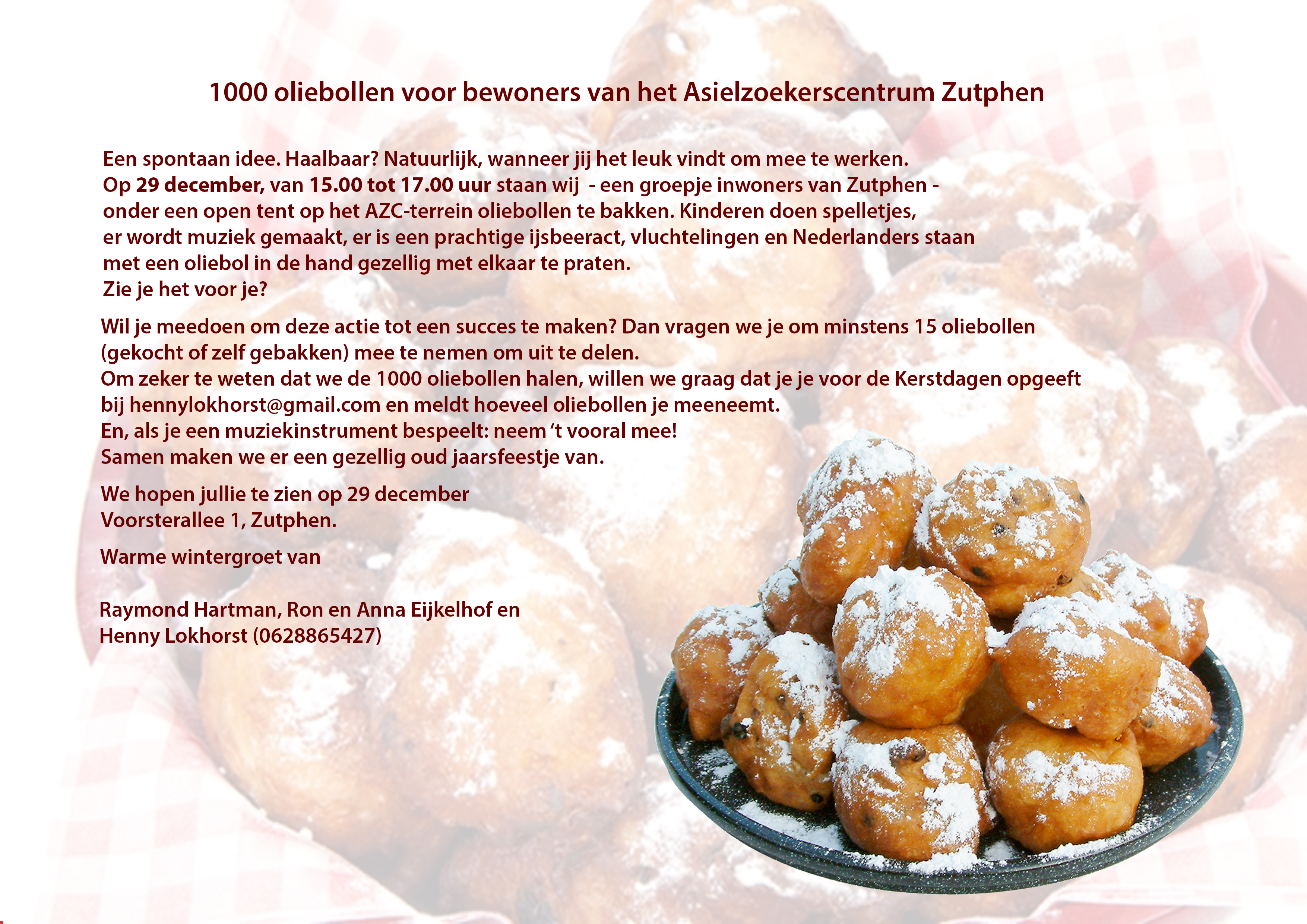 Henny: “Ik deed mee aan de training Buitengewoonzijn.nu, waarin deelnemers worden aangespoord om een belangeloos en maatschappelijk relevant initiatief te ontplooien. Zo kwam ik op het idee om iets voor vluchtelingen te doen samen met Zutphenaren. Het plan ontstond om oliebollen uit te delen en mensen te vragen zelf oliebollen mee te brengen naar het azc zodat (tijdelijke) Zutphenaren met elkaar in contact komen.