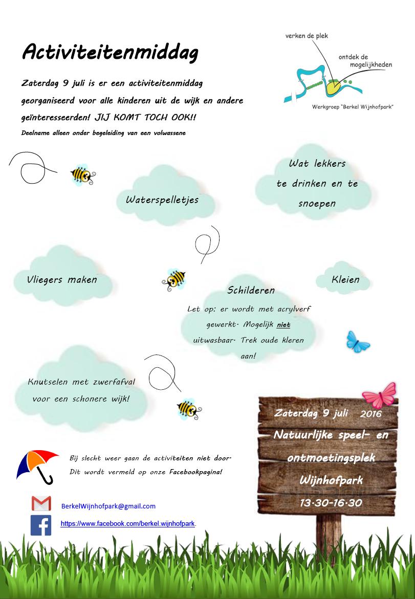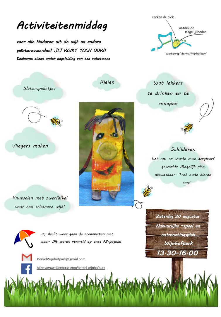 De werkgroep “Berkel Wijnhofpark” organiseert deze zomer meerdere activiteitenmiddagen met onder meer schilderen, waterspelletjes doen en vliegers maken in de natuurlijke speel- en ontmoetingsplek in het Wijnhofpark. Voor een schonere wijk kon je ook knutselen met zwerfafval!