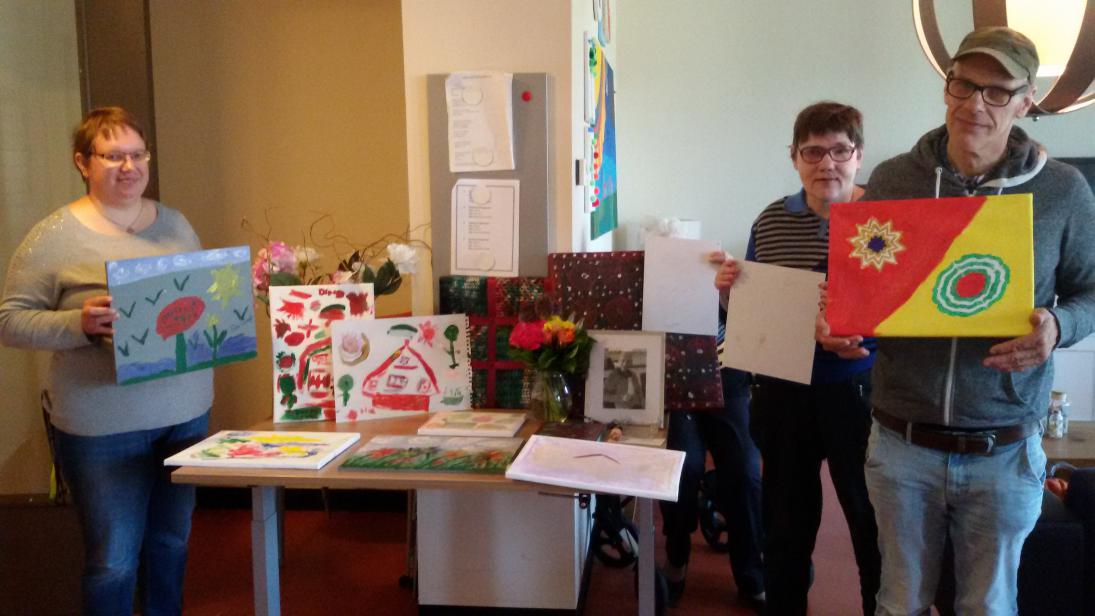 Op de foto hieronder tonen zij de schilderijtjes in de hoop dat u deze wilt kopen voor het goede doel.