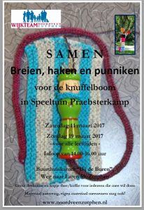 Veel wijkbewoners helpen al mee met het realiseren van een knuffelboom in speeltuin Praebsterkamp door lapjes te breien van verschillende maten en in allerlei kleuren. Wie niet van breien houdt, mag ook haken of punniken. Ook mogen er poppetjes en diertjes van wol gemaakt worden om in de knuffelboom te hangen.