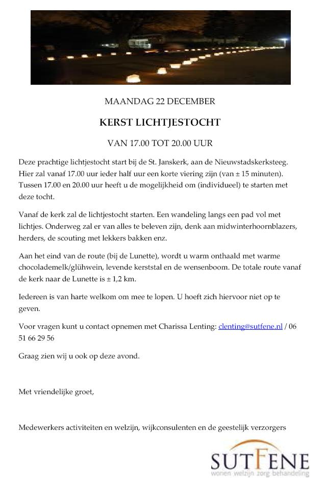 Medewerkers activiteiten en welzijn, wijkconsulenten en de geestelijk verzorgers van Sutfene nodigen u uit om op maandag 22 december a.s. deel te nemen aan de Kerst lichtjestocht die plaatsvindt tussen 17.00 en 20.00 uur. Deze prachtige lichtjestocht start bij de St. Janskerk, aan de Nieuwstadskerksteeg. Hier zal vanaf 17.00 uur ieder half uur een korte viering zijn […]