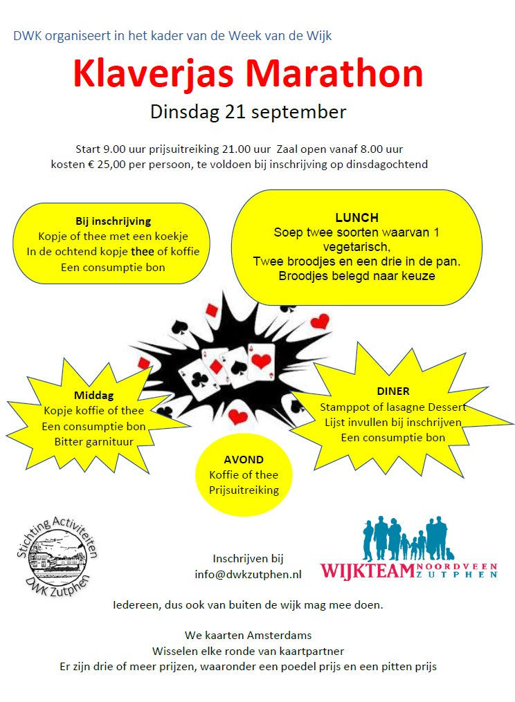 DWK organiseert in het kader van de Week van de Wijk een Klaverjas Marathon op dinsdag 21 september. De dag start om 9.00 uur, de prijsuitreiking is om 21.00 uur. Zaal open vanaf 8.00 uur.De kosten voor deze geheel verzorgde dag met koffie/thee, lunch en diner bedragen € 25,00 per persoon, (contant!) te voldoen bij