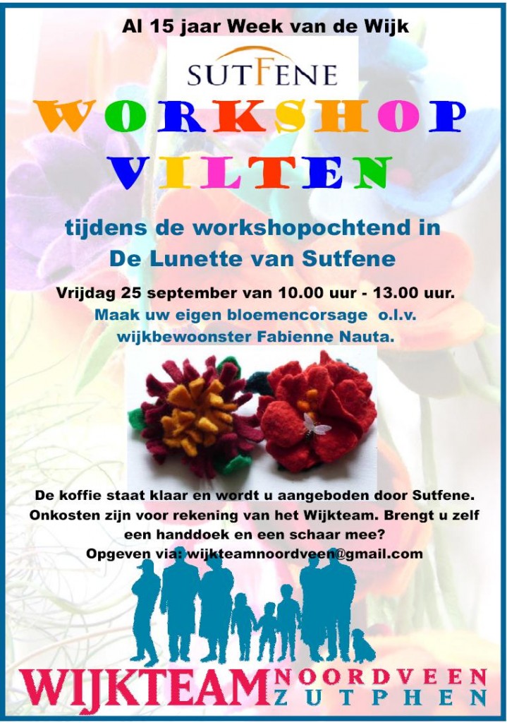 Workshopochtend in de Lunette van Sutfene met: 10.00-13.00 uur Kennismakingsworkshop Vilten (Let op: voor wie zich vooraf heeft opgeven!) 10.00-11.00 uur Presentatie Wehelpen.nl in zaal de Coehoorn (óók voor beroepskrachten!) 11.00-12.30 uur Inloopworkshop Wehelpen.nl in de computerruimte van Studio 3. Informatie over de workshops Wehelpen.nl kunt u ook in de bijlage lezen. 13.30-15.30 uur Introductieworkshop Leven
