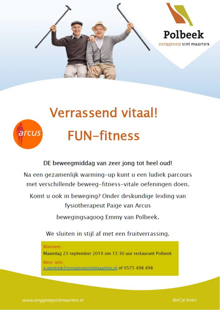 FUN-fitness, DE beweegmiddag van zeer jong tot heel oud! Op maandag 23 september vanaf 15.30 uur in Polbeek, Van Dorenborchstraat 1. Verzamelpunt: informatiebalie / Grand Café. Na een gezamenlijk warming-up kun je een ludiek parcours met verschillende beweeg-fitness-vitale oefeningen doen. Kom je ook in beweging? Onder deskundige leiding van fysiotherapeut Paige van Arcus en bewegingsagoog […]