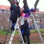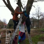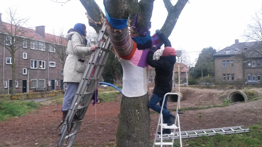 Nadat er door jong en oud in september was gebreid, gehaakt en gepunnikt, tijdens de Week van de Wijk 2014, maar ook nog daarna, kreeg speeltuin Praebsterkamp in oktober een winterjas aan.