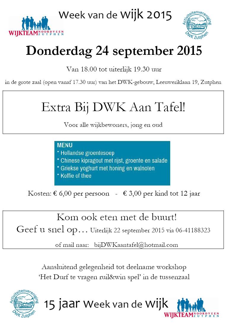 18.00-19.30 uur Extra Bij DWK Aan Tafel: Eten met de buurt, voor alle wijkbewoners, jong en oud, uiterlijk 22-09-2015 opgeven via 06-411 883 23 of bijDWKaantafel@hotmail.com