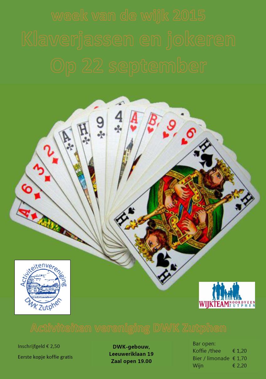 Kaartavond – Week van de Wijk 2015Door Chantal Elskamp / 5 september 2015 Evenementgegevens Datum: 22 september 2015 19:30 – 22:00 Locatie: DWK Gebouw Categorieën: Wijkagenda Zoekwoorden: DWK, kaartavond, Leeuweriklaan, Noordveen, week van de wijk 19.30-22.00 uur Klaverjassen en jokeren in de grote zaal van DWK-gebouw, zaal en bar open vanaf 19.00 uur, kosten € 2,50 p.p. en eerste kopje koffie gratis.
