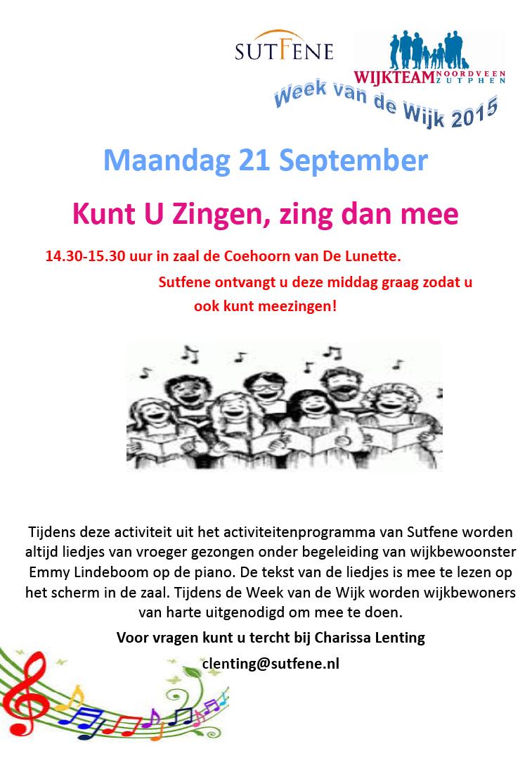 Tijdens deze activiteit uit het activiteitenprogramma van Sutfene worden altijd liedjes van vroeger gezongen onder begeleiding van wijkbewoonster Emmy Lindeboom op de piano. De tekst van de liedjes is mee te lezen op het scherm in de zaal. Tijdens de Week van de Wijk worden wijkbewoners van harte uitgenodigd om mee te doen.