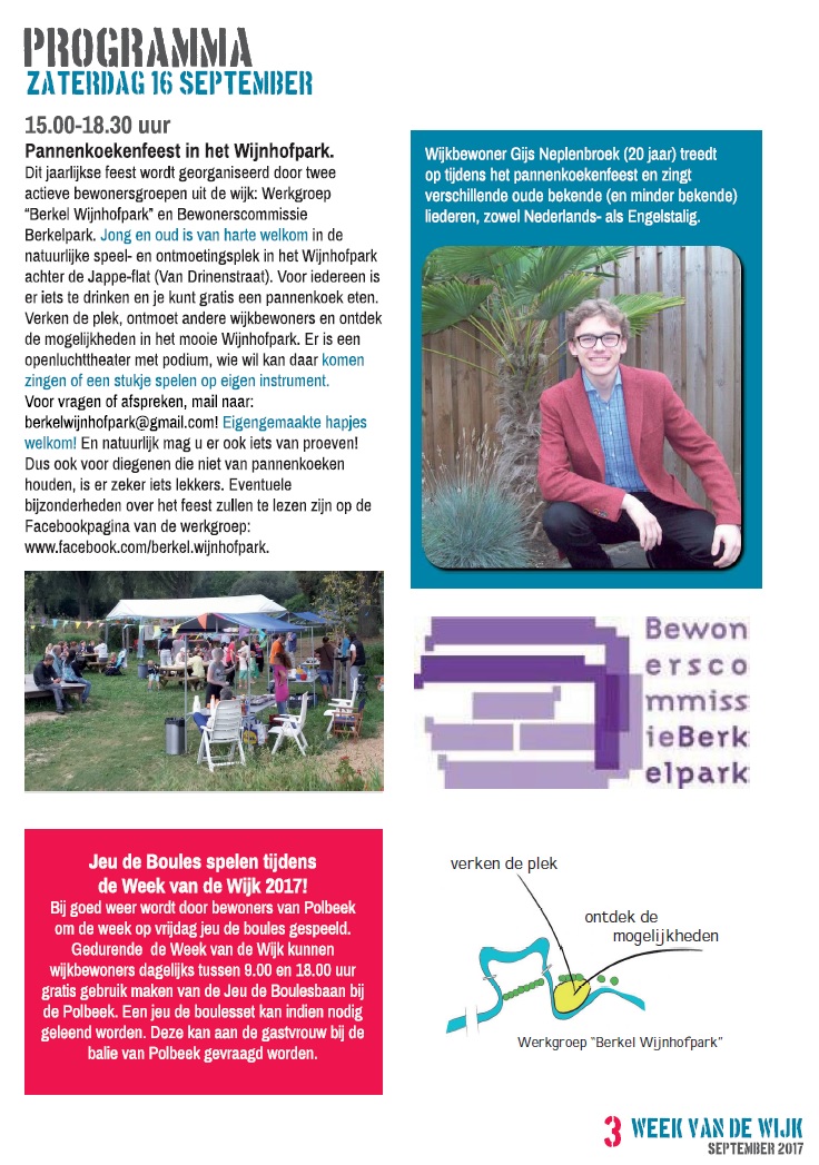 Op deze eerste zaterdag tijdens de Week van de Wijk 2017 organiseert de Werkgroep “Berkel Wijnhofpark” een activiteit in de natuurlijke speel- en ontmoetingsplek in het Wijnhofpark, gelegen in de buurt Berkelpark van de wijk Noordveen in Zutphen i.s.m. Bewonerscommissie Berkelpark.