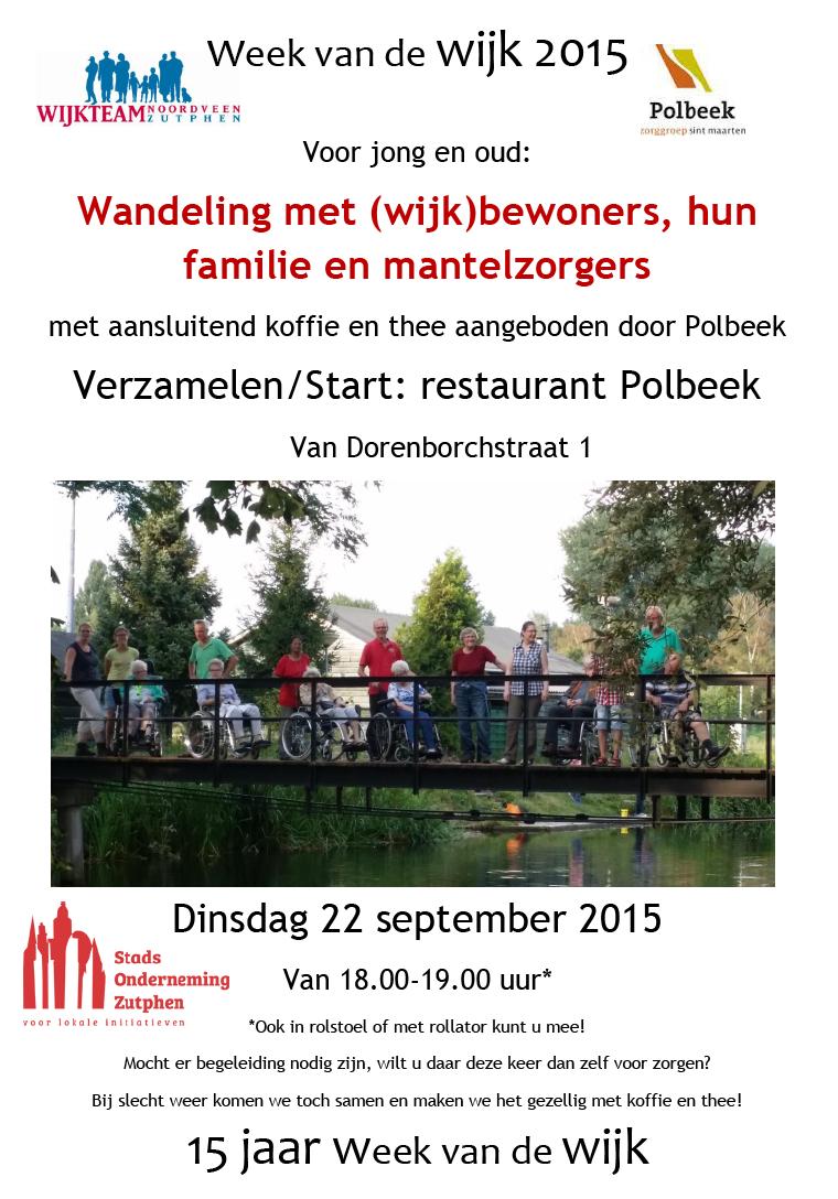In 2014 werd de wandelclub vanuit Polbeek georganiseerd door vrijwilligers van Bewonerscommissie Berkelpark, dit jaar is de organisatie overgenomen door vrijwilligers van Stichting Stadsonderneming Zutphen. Elke week wordt gewandeld door de wijk Noordveen en afgesloten met gezamenlijk koffie/thee drinken, aangeboden door Polbeek. Er wordt gestreefd zoveel mogelijk bewoners in rolstoel mee te kunnen nemen, maar daarvoor zijn natuurlijk wel rolstoelduwers nodig. Gaan jullie ook mee? De wandeling is voor alle leeftijden, kinderen en jongeren zijn dus ook welkom, evenals familie en mantelzorgers!