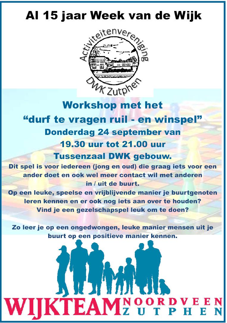 19.30- 21.00 uur Workshop: “Het durf te vragen ruil- & win spel” in de tussenzaal van het DWK-gebouw onder leiding van René en wijkbewoonster Fenna.
