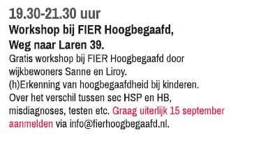 Workshop Hoogbegaafdheid bij kinderen – Week van de Wijk 2016Door Chantal Elskamp / 4 september 2016 Evenementgegevens Datum: 16 september 2016 19:30 – 21:30 Locatie: Fier Hoogbegaafd Categorieën: Wijkagenda Zoekwoorden: hoogbegaafdheid, kinderen, week van de wijk, Weg naar Laren, workshop Voor deze workshop tijdens de Week van de Wijk op vrijdag 16 september is aanmelding gewenst op uiterlijk 15 september via info@fierhoogbegaafd.nl.