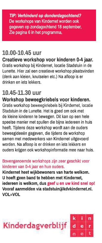 Workshopochtend Kindernet – Week van de Wijk 2016Door Chantal Elskamp / 4 september 2016 Evenementgegevens Datum: 22 september 2016 10:00 – 11:30 Locatie: Kindernet - locatie Stadstuin in de Lunette Categorieën: Wijkagenda Zoekwoorden: bewegen, creatieve activiteit, De Lunette, kinderen, Kindernet, week van de wijk, workshop Tijdens deze workshopochtend worden twee workshops gegeven: 10.00-10.45 uur: Creatieve workshop voor kinderen 0-4 jaar 10.45-11.00 uur: Workshop beweegkriebels voor kinderen Let op: Vooraf opgeven!!