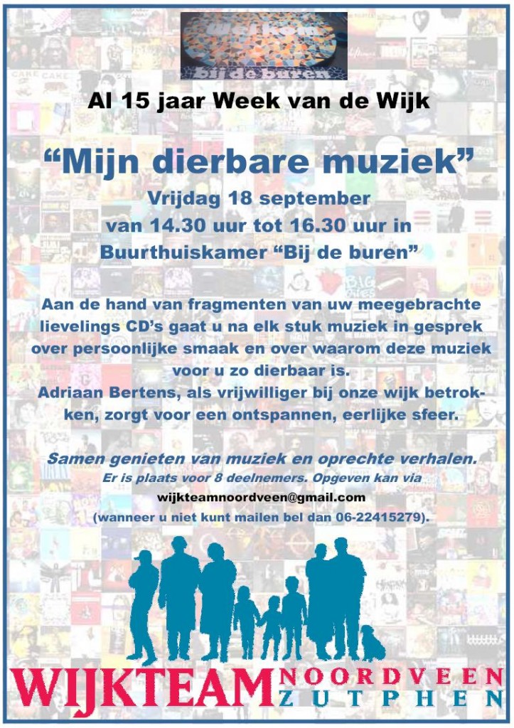 Er is plaats voor een achttal deelnemers die samen hun op CD meegebrachte dierbare muziek delen en daarover in gesprek gaan. Uiterlijk 17 september opgeven via e-mail wijkteamnoordveen@gmail.com (wanneer u niet kunt mailen, bel dan 06-22415279).