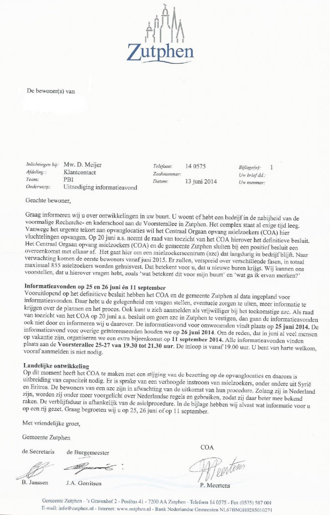 In deze brief was onder meer te lezen dat de Raad van Toezicht van het COA op 20 juni 2014 het definitieve besluit zou nemen of het nu leegstaande complex inderdaad zal worden gekocht en verbouwd zodat het in gebruik genomen kan worden als asielzoekerscentrum. Op voorhand zijn drie informatieavonden gepland.