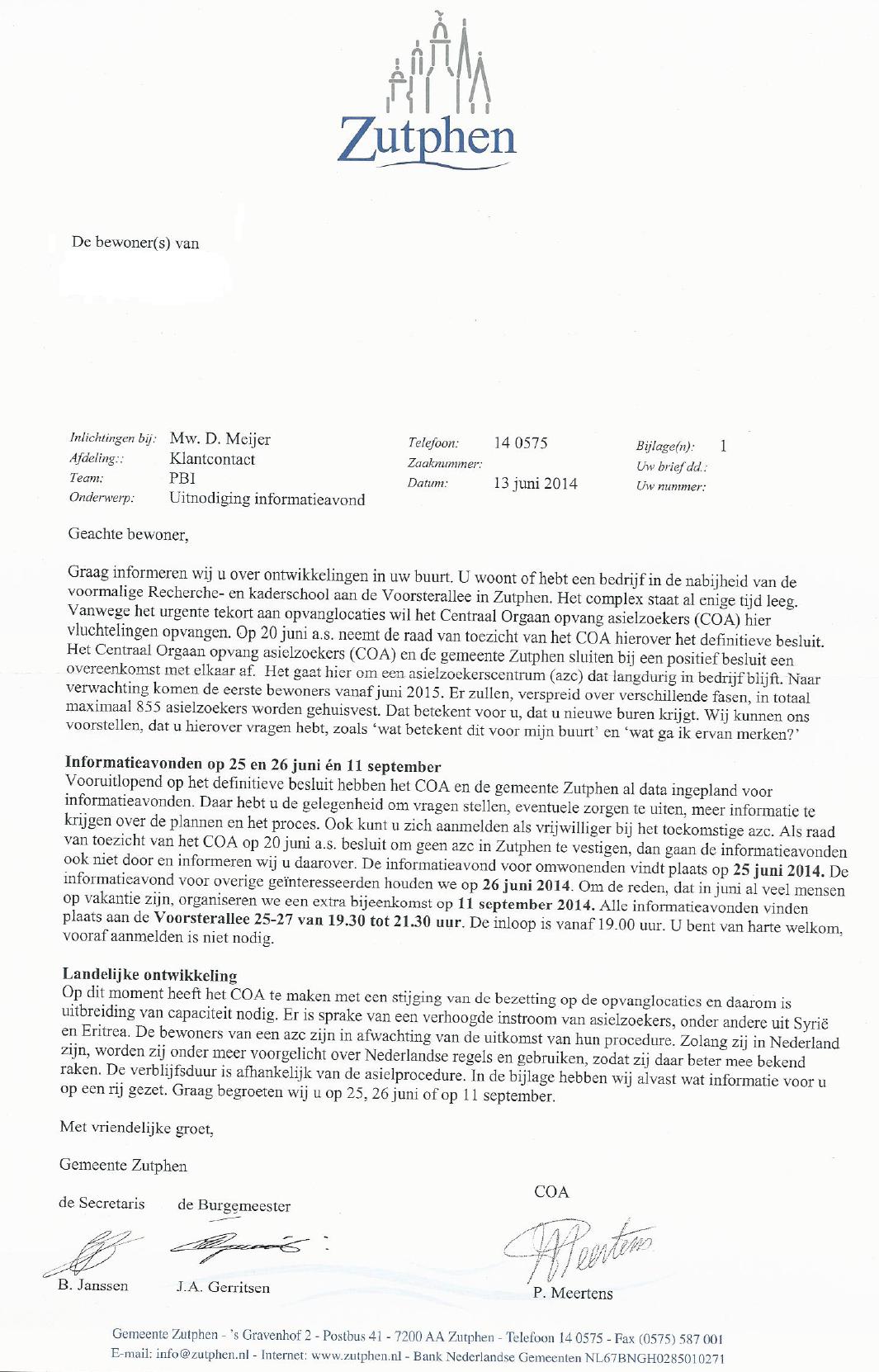 In deze brief was onder meer te lezen dat de Raad van Toezicht van het COA op 20 juni 2014 het definitieve besluit zou nemen of het nu leegstaande complex inderdaad zal worden gekocht en verbouwd zodat het in gebruik genomen kan worden als asielzoekerscentrum. Op voorhand zijn drie informatieavonden gepland.