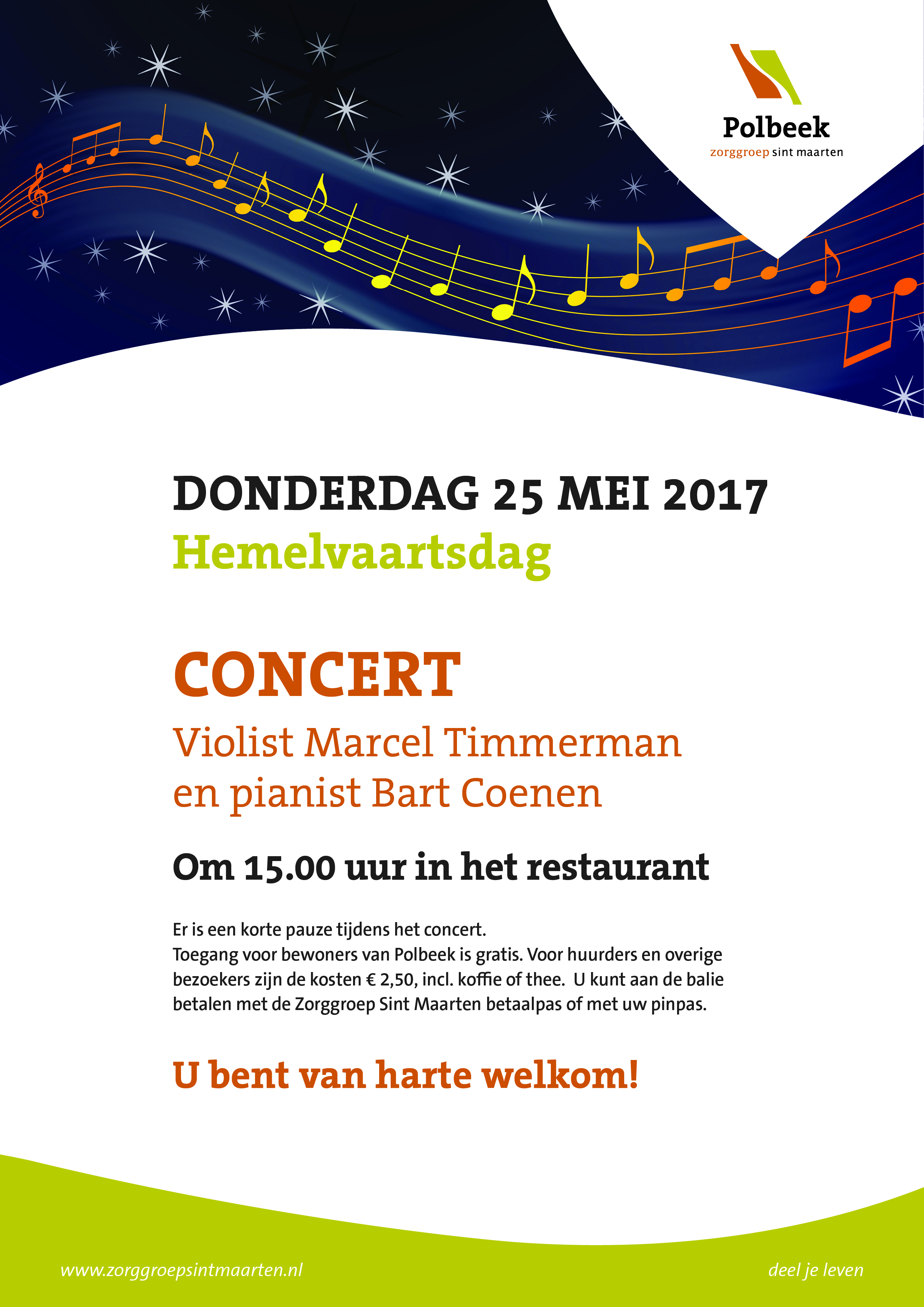 Hemelvaartsdag in Polbeek: klassiek concertNieuws Op Hemelvaartsdag 2017 is eenieder van harte welkom voor een klassiek concert in Polbeek. Voor meer informatie zie onderstaande flyer.