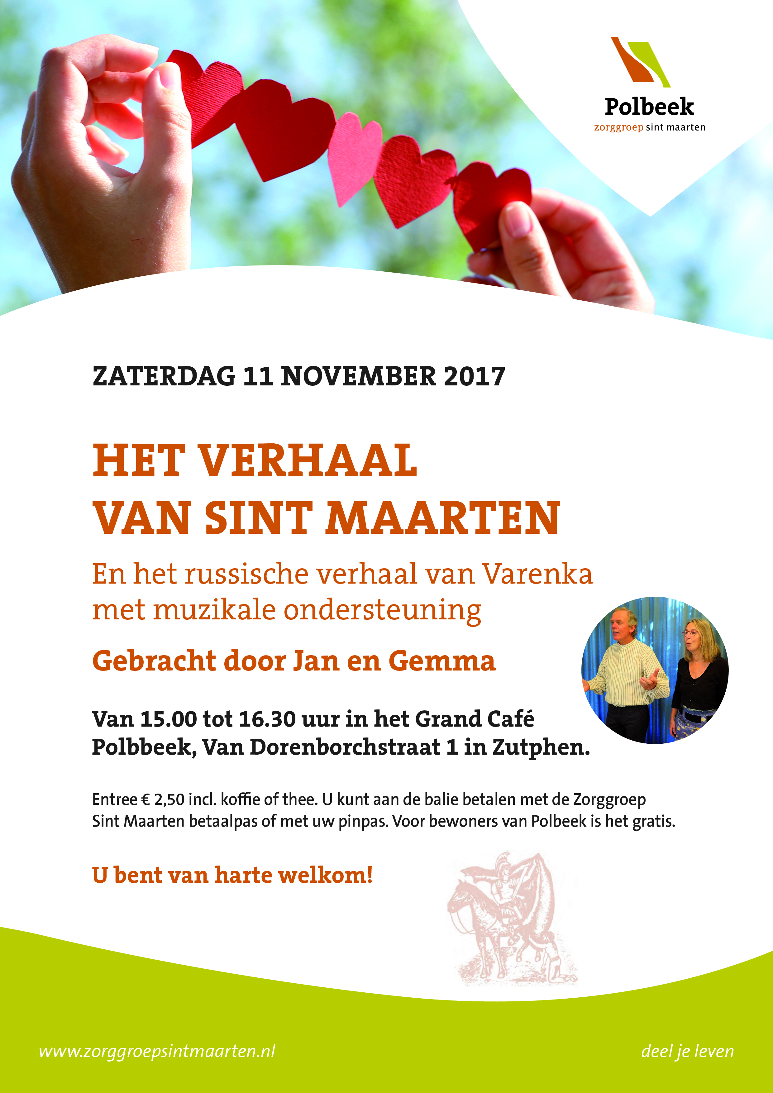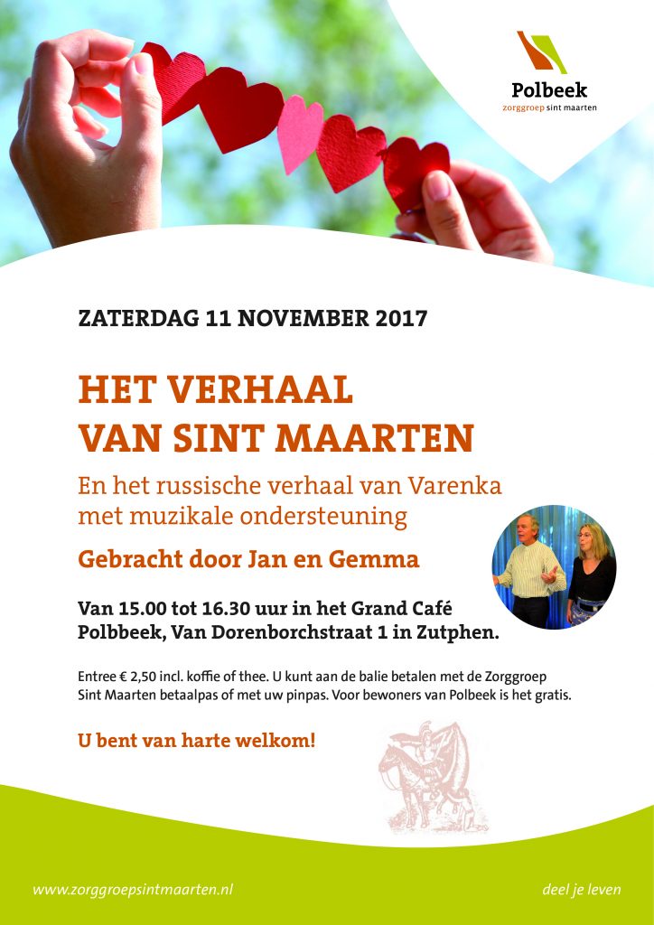 Het verhaal van Sint Maarten / Nieuws / Door Chantal Elskamp In Polbeek, Van Dorenborchstraat 1, bent u op zaterdag 11 november van harte welkom om 15.00 uur voor het verhaal van Sint Maarten. Zie onderstaande flyer.