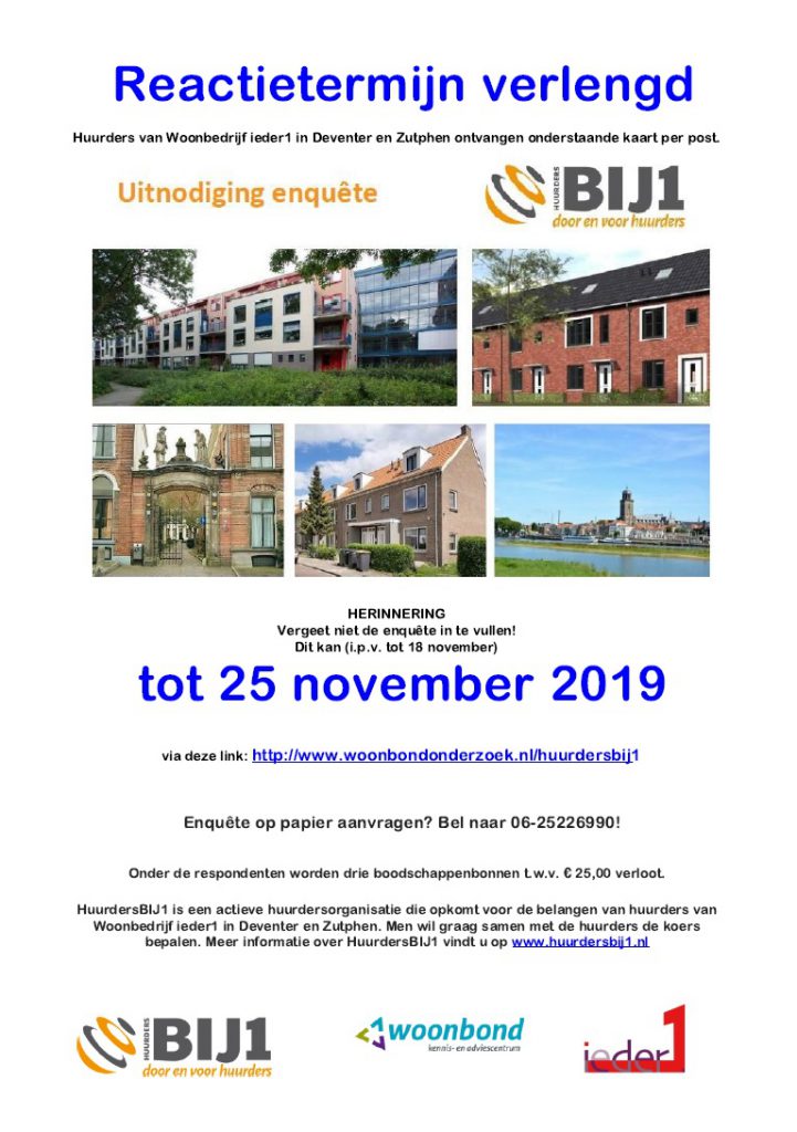 HuurdersBIJ1 is een actieve huurdersorganisatie die opkomt voor de belangen van huurders van Woonbedrijf ieder1 in Deventer en Zutphen. Men wil graag samen met de huurders de koers bepalen. Men heeft daarom de Woonbond gevraagd om via een (digitale) enquête de mening van de huurders op te halen. De enquête kunnen de huurders invullen via http://www.woonbondonderzoek.nl/huurdersbij1.