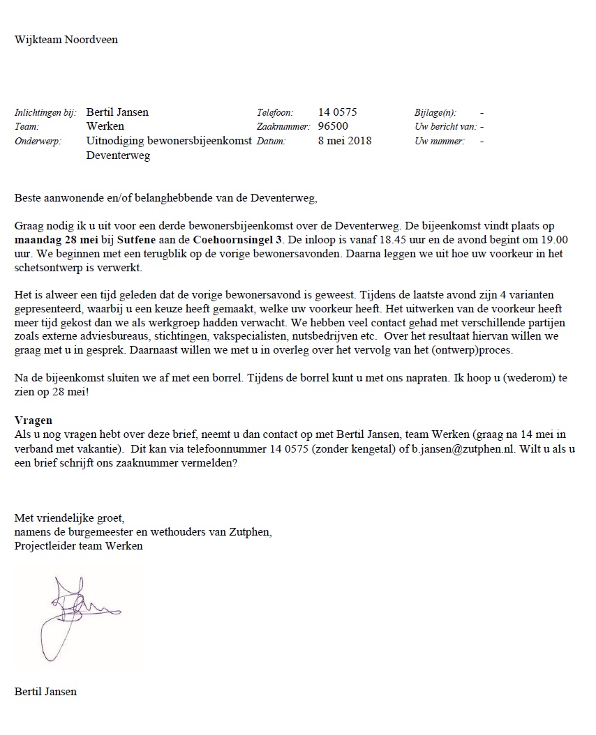 Op dinsdagavond 28 mei 2018 vindt opnieuw een informatieavond plaats over de herinrichting van de Deventerweg. Op deze informatieavond worden de aanwezigen geïnformeerd over de stand van zaken en wordt het verdere (ontwerp)proces besproken. De locatie is De Lunette van Sutfene, Coehoornsingel 3, inloop vanaf 18.45 uur (de hieronder vermelde eindtijd is een geschatte tijd).