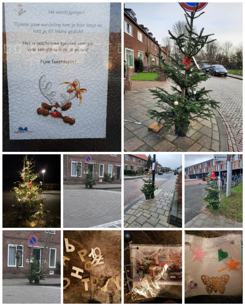 Verspreid door de wijk vond u in december 2020 en begin 2021 kerstbomen op openbare plekken. We nodigden wijkbewoners uit om er hun Kerst- of Nieuwjaarswens in te hangen. Of om hem te versieren. Bijvoorbeeld met de kinderen uit de buurt. Kortom: om de boom te gebruiken om het buiten gezellig te maken en (anoniem) te laten weten wat uw wens is.