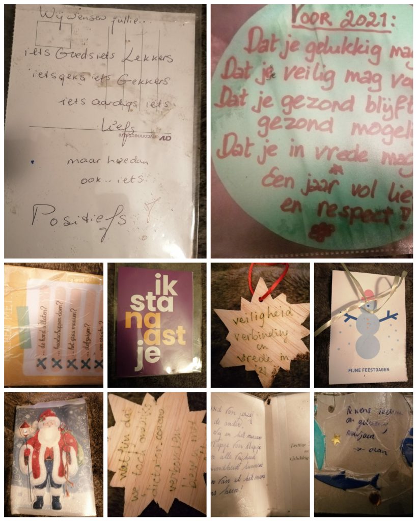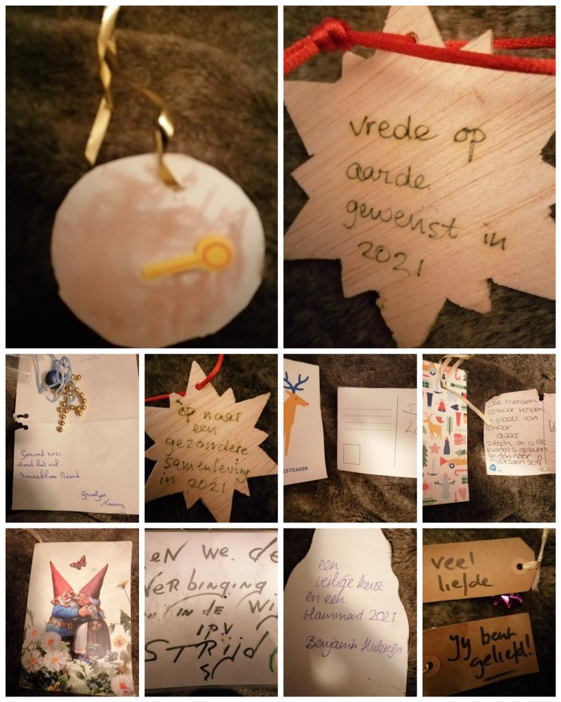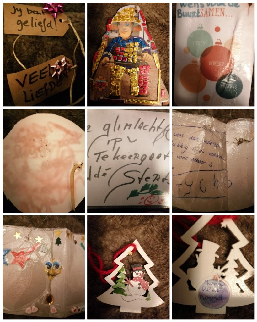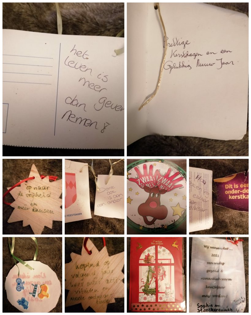 Op maandag 11 januari haalden we de bomen weer op, met alles wat er in hing. De wensen wilden we graag bewaren. En we maakten foto’s van alles wat er in hing. Ontzettend leuk! Zie de fotocollages hieronder.