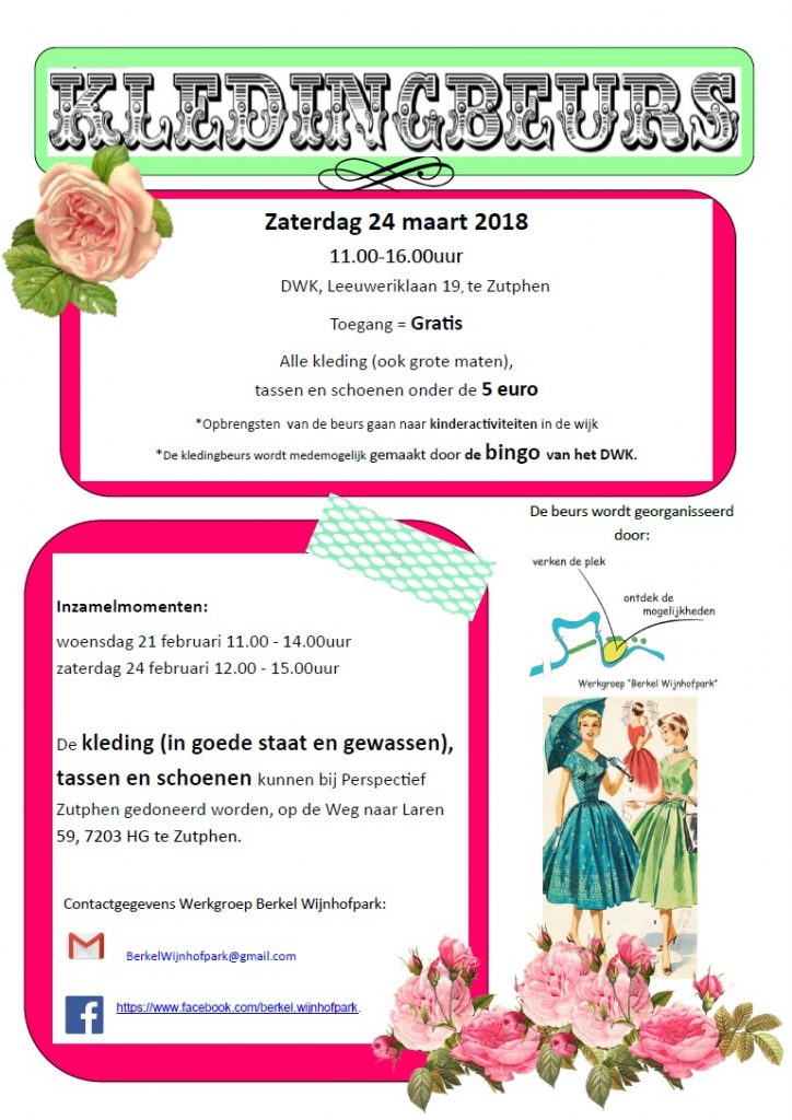 Om ook in 2018 leuke (kinder)activiteiten te kunnen blijven organiseren, houdt de werkgroep op zaterdag 24 maart 2018 weer een kledingbeurs in het DWK-gebouw. Opnieuw is de opbrengst geheel voor (kinder)activiteiten in de wijk. U kunt ook kleding, tassen en schoenen (voor kinderen èn volwassenen) doneren en op die manier de activiteiten van de werkgroep steunen. In november 2018 zal er een kledingbeurs in het Rode Kruisgebouw zijn. Data van die beurs en de inzamelingen daarvoor volgen.