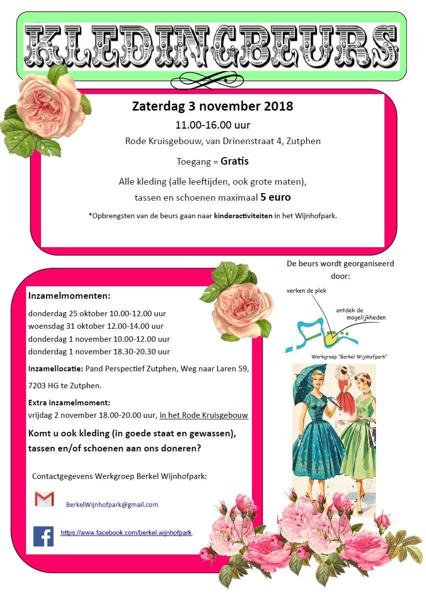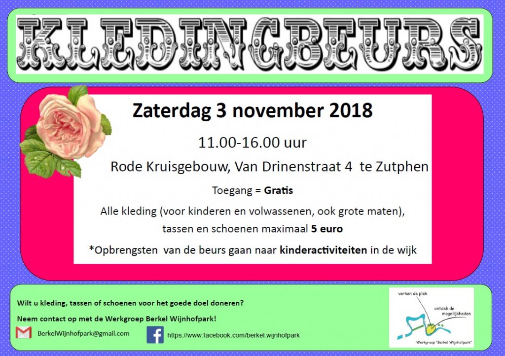 Op zaterdag 3 november 2018 houdt de Werkgroep Berkel Wijnhofpark een kledingbeurs in het Rode Kruisgebouw, Van Drinenstraat 4 in Zutphen. Dit werd door de werkgroep aangekondigd tijdens de braderie van de Week van de Wijk 2018.
