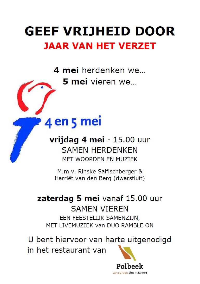 Op 5 mei is er een feestelijk samenzijn met live muziek van DUO RAMBLE ON.