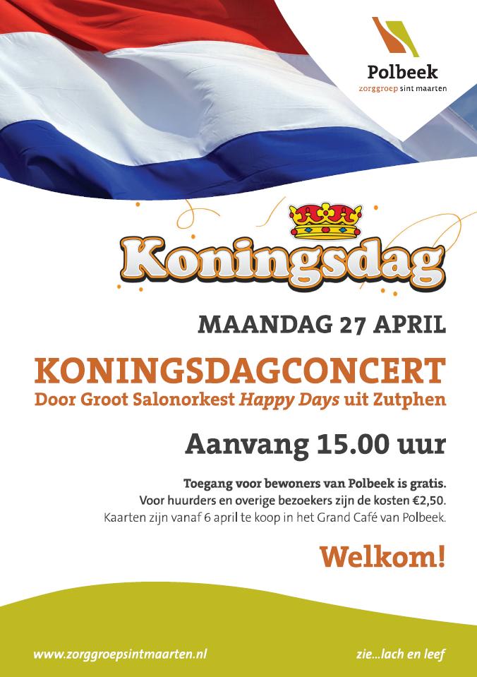 Koningsdagconcert in Polbeek / Nieuws / Door Chantal Elskamp Polbeek nodigt wijkbewoners en andere geïnteresseerden uit voor een concert op Koningsdag. Kaarten à € 2,50 zijn vanaf 6 april 2015 verkrijgbaar in het Grand Café van Polbeek.