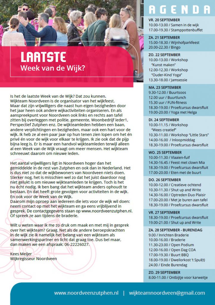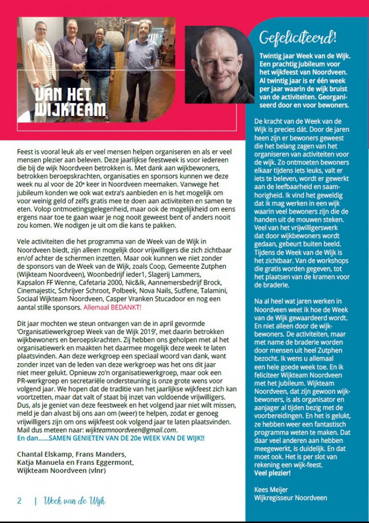 Heeft u vragen of opmerkingen of wilt u zich aanmelden als vrijwilliger voor 2020? Uw e-mail kunt u sturen aan wijkteamnoordveen@gmail.com.