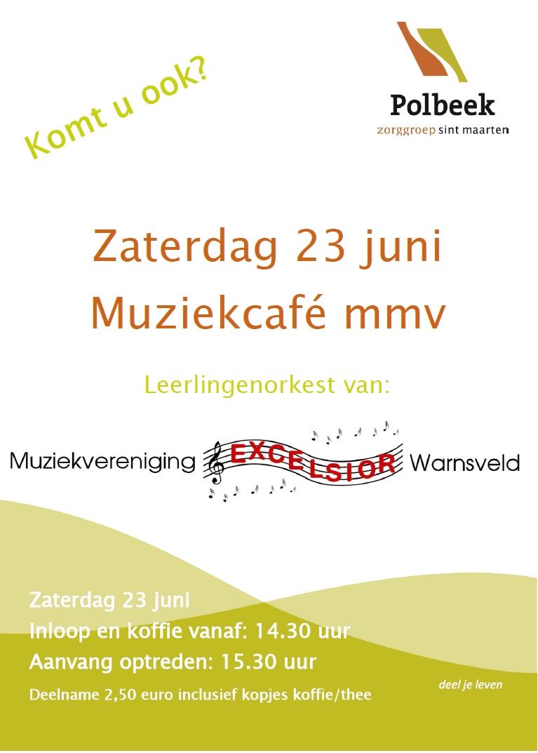 In Polbeek bent u van harte welkom voor het muziekcafé op zaterdagmiddag 23 juni. Het leerlingenkoor van muziekvereniging Excelsior Warnsveld zal hier vanaf 15.30 uur optreden. U bent al welkom vanaf 14.30 uur voor inloop met koffie. Polbeek vraagt voor deze middag een bijdrage van € 2,50 p.p., te voldoen middels Polbeekpas of pinpas (contant betalen is niet mogelijk).