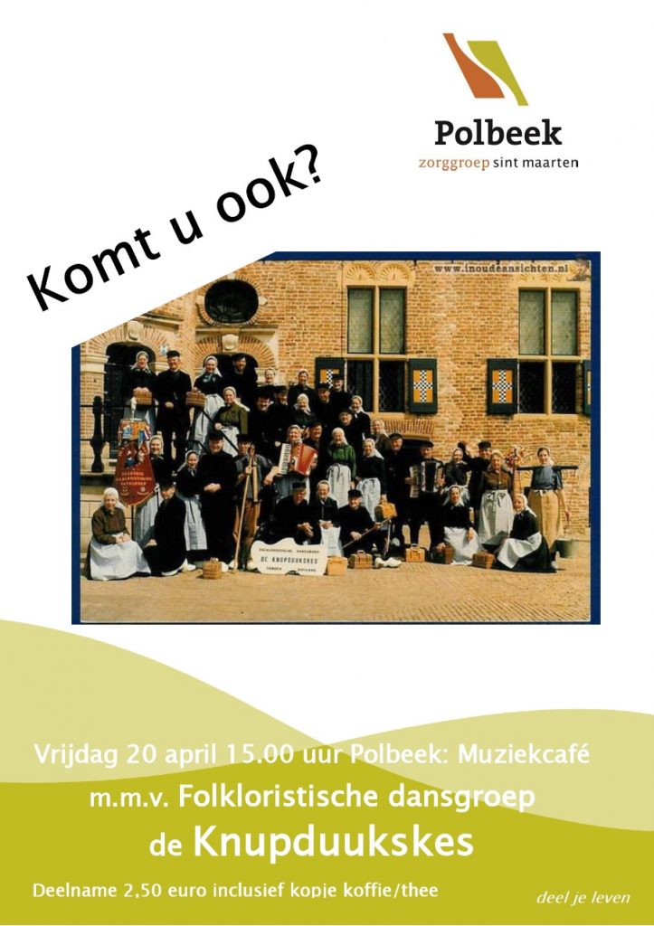 Muziekcafé Polbeek m.m.v. Folkloristische dansgroep de Knupduukskes / Nieuws / Door Chantal Elskamp Vrijdag 20 april 15.00 uur Polbeek: Muziekcafé m.m.v. Folkloristische dansgroep de Knupduukskes Deelname 2,50 euro inclusief kopje koffie/thee