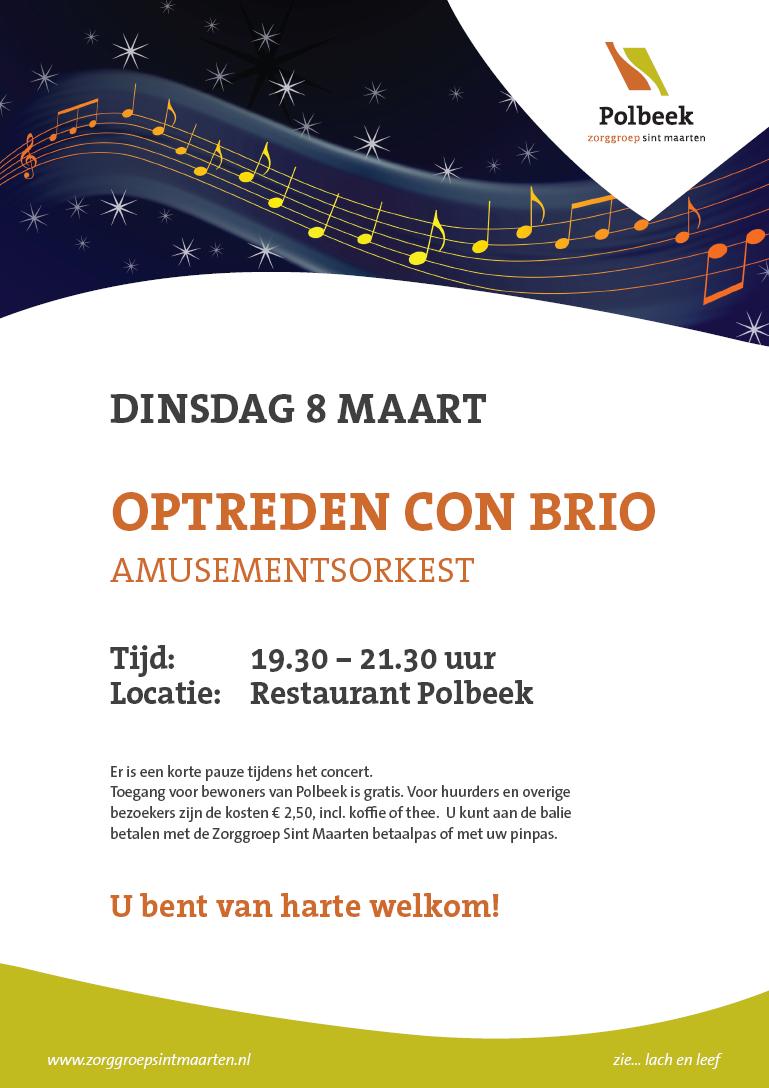 Op dinsdag 8 maart heet Polbeek u van harte welkom voor een optreden van amusementsorkest Con Brio in het restaurant van het Woon-zorgcentrum, Van Dorenborchstraat 1. Het optreden begint om 19.30 uur en zal rond 21.30 uur ten einde zijn. Er is een korte pauze tijdens het concert. Toegang voor bewoners van Polbeek is gratis. Voor huurders en overige bezoekers zijn de kosten € 2,50, incl. koffie of thee. U kunt aan de balie betalen met de Zorggroep Sint Maarten betaalpas of met uw pinpas. U bent van harte welkom!