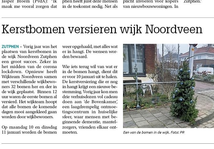 In december 2020 was het plaatsen van kerstbomen in het wild in de wijk Noordveen Zutphen een groot succes. Zeker in het midden van de corona lockdown.