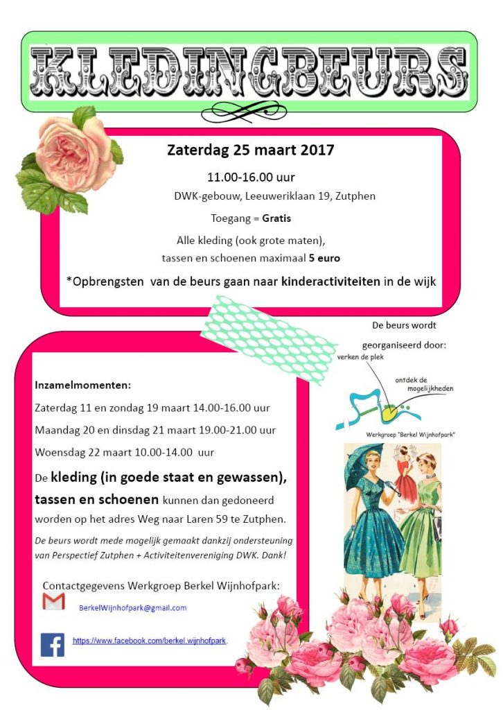 Om ook in 2017 leuke (kinder)activiteiten te kunnen blijven organiseren, heeft de werkgroep op zaterdag 26 november 2016 van 11.00-16.00 uur een kledingbeurs in het Rode Kruisgebouw gehouden. Op 25 maart 2017 vindt opnieuw een kledingbeurs plaats, ditmaal in het DWK-gebouw. Opnieuw is de opbrengst geheel voor (kinder)activiteiten in de wijk. U kunt ook kleding, tassen en schoenen doneren en op die manier de activiteiten van de werkgroep steunen.