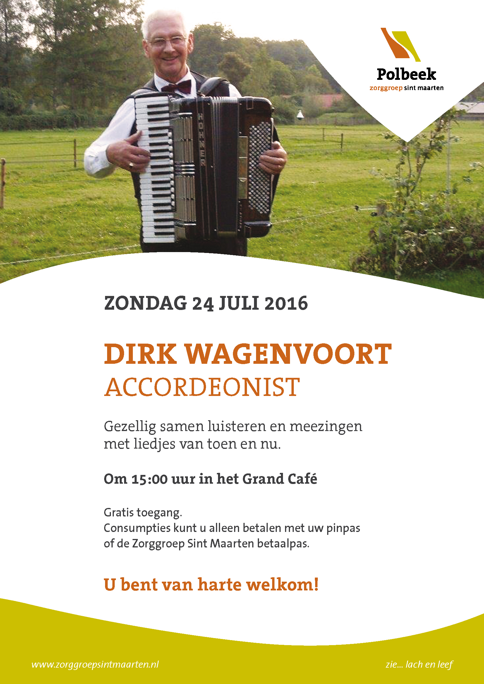 Optreden accordeonist Dick Wagenvoort in Polbeek / Nieuws / Door Chantal Elskamp Op 24 juli is het culturele zondag in Polbeek en is er een optreden van accordeonist Dick Wagenvoort in Grand Café om 15.00 uur. Komt u ook luisteren en/of meezingen?