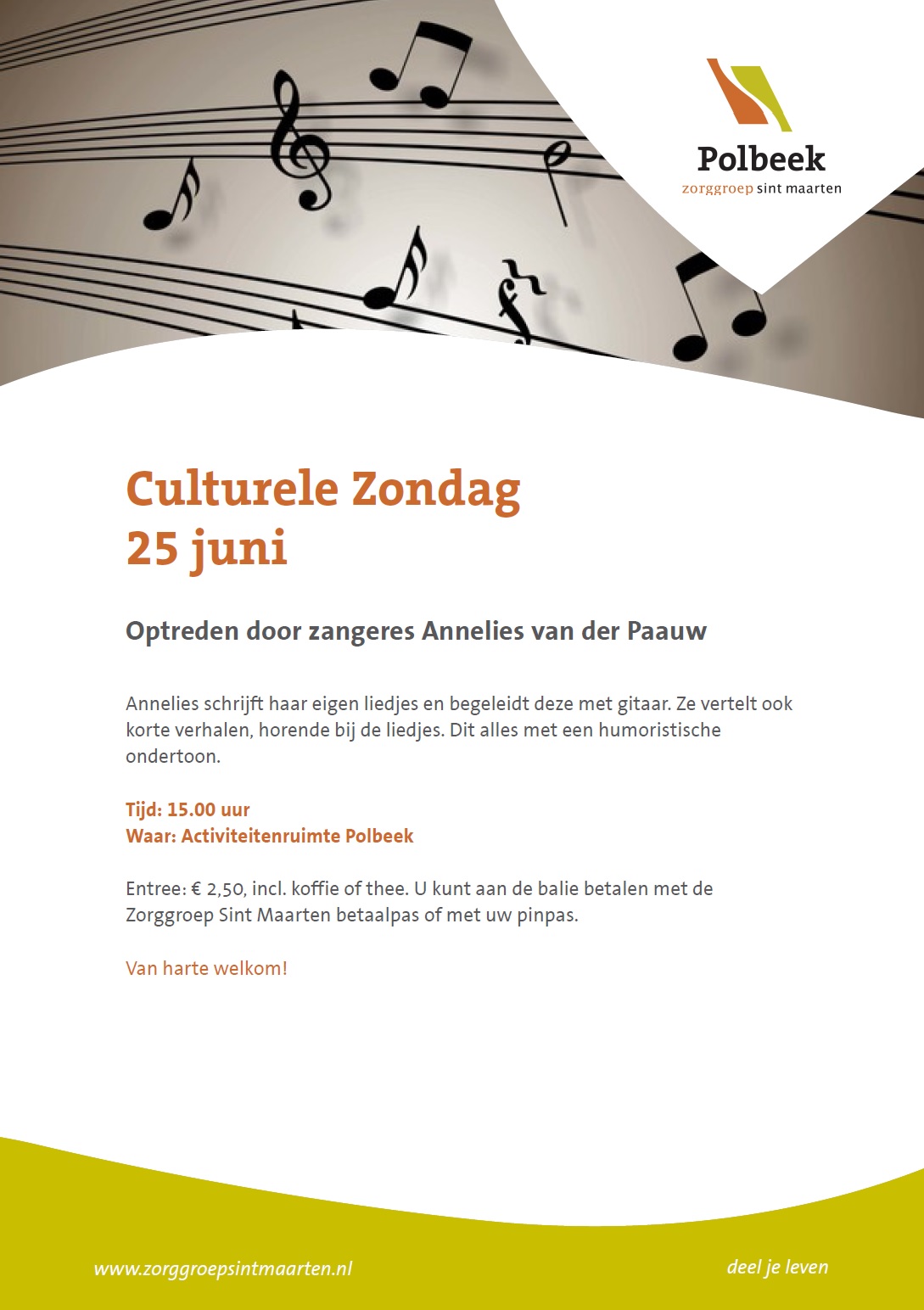 Optreden Annelies van der Paauw in Polbeek / Nieuws / Door Chantal Elskamp Op zondag 25 juni zijn alle wijkbewoners en andere geïnteresseerden van harte welkom in Polbeek om het optreden van Annelies van der Paauw bij te wonen. Voor meer informatie, zie onderstaande uitnodiging.