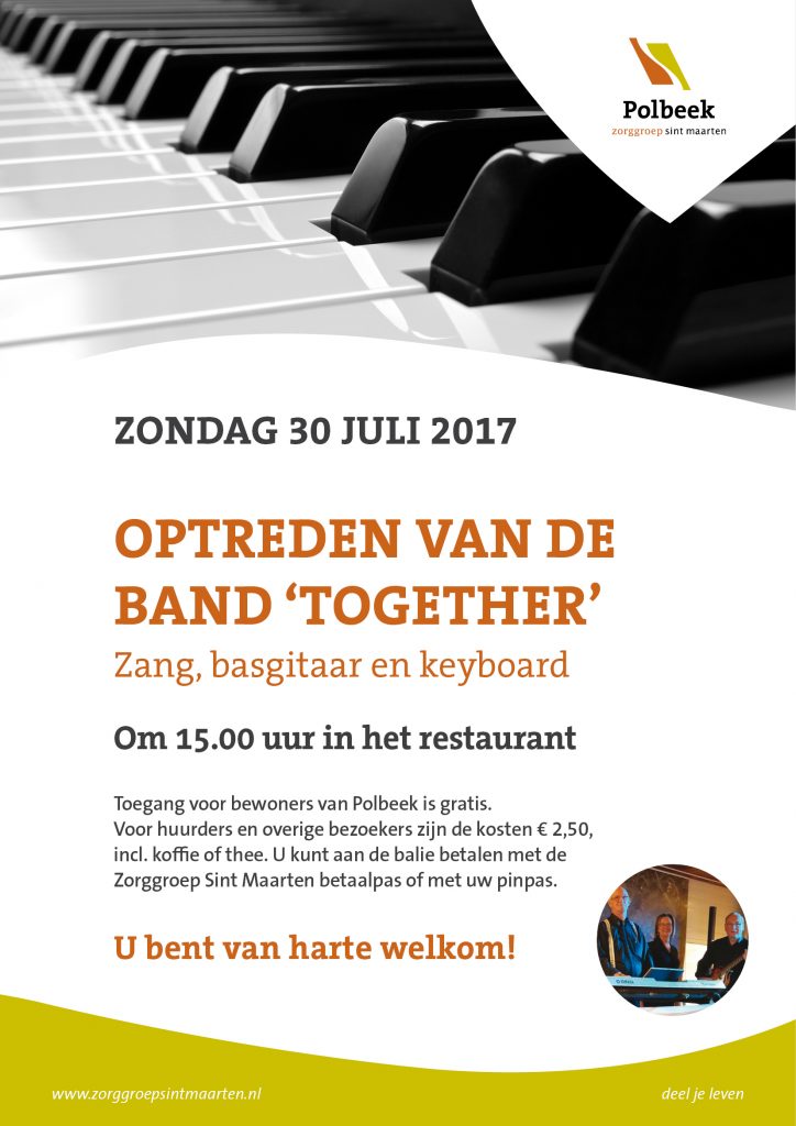Optreden band ‘Together’ in Polbeek / Nieuws / Door Chantal Elskamp Op zondag 30 juli 2017 treedt in Polbeek de band ‘Together’ op. Iedereen is van harte welkom dit optreden bij te wonen. Voor meer informatie, zie onderstaande flyer.