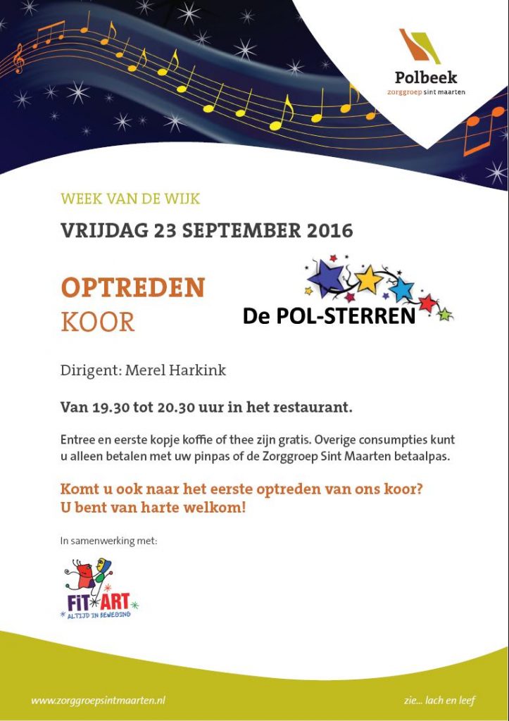 Optreden koor POL-sterren in Polbeek / Nieuws, Projecten, Week van de wijk, Week van de wijk 2016 / Door Chantal Elskamp Er is speciaal voor u geoefend, kom naar dit eerste optreden van het wijkkoor van Noordveen: