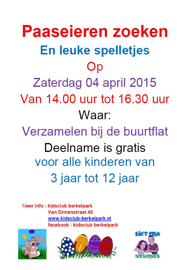 Kinderen die de smaak te pakken hebben, kunnen ’s middags aan de andere kant van het fietstunneltje ook nog eieren zoeken tijdens de paasmiddag van Kid’s Club Berkelpark.