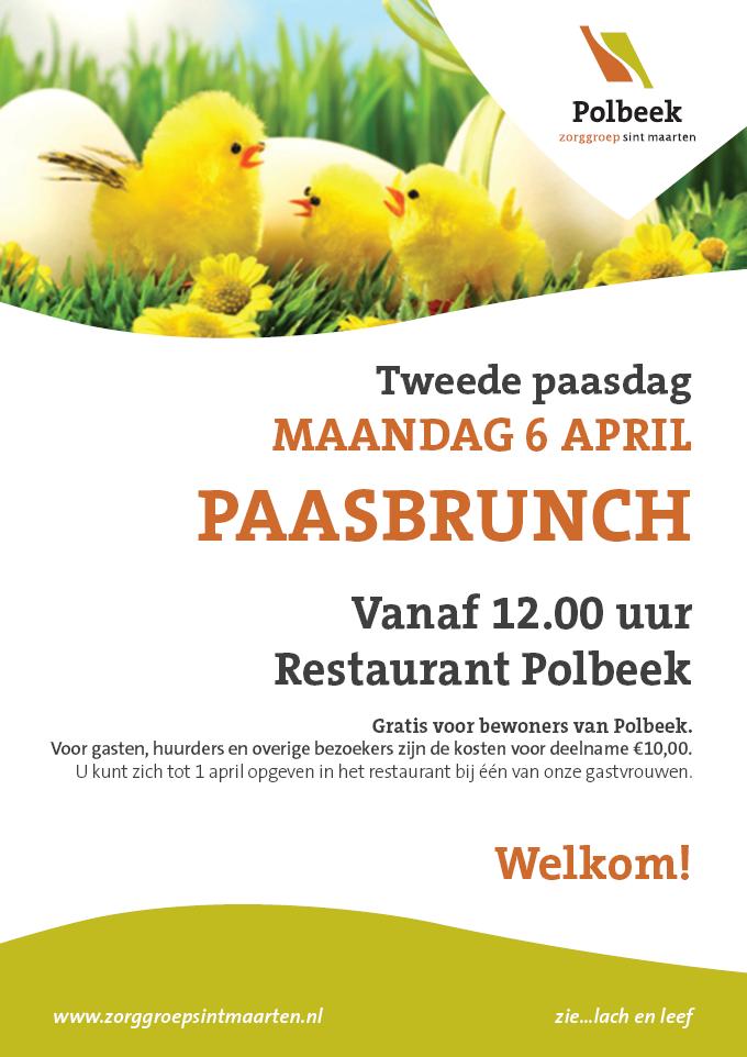 Paasbrunch in Polbeek op maandag 6 april / Nieuws / Door Chantal Elskamp Klik op de affiche voor een uitvergroting Tweede Paasdag organiseert Polbeek een brunch. “Bewoners uit de wijk zijn uiteraard van harte welkom” liet men vanuit Polbeek weten. Dus lees meer over deze brunch op de affiche hiernaast, geef u op voor 1 april 2015 en geniet met de Pasen!