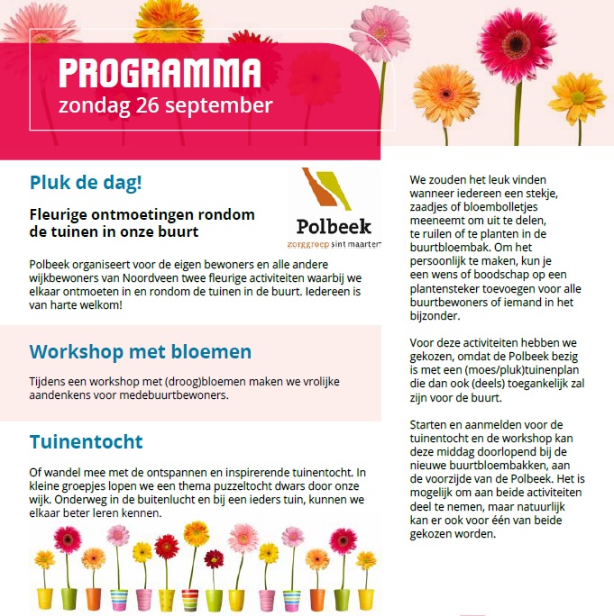Polbeek organiseert zondag 26 september voor de eigen bewoners en alle andere wijkbewoners van Noordveen twee fleurige activiteiten waarbij we elkaar ontmoeten in en rondom de tuinen in de buurt. Iedereen is van harte welkom!