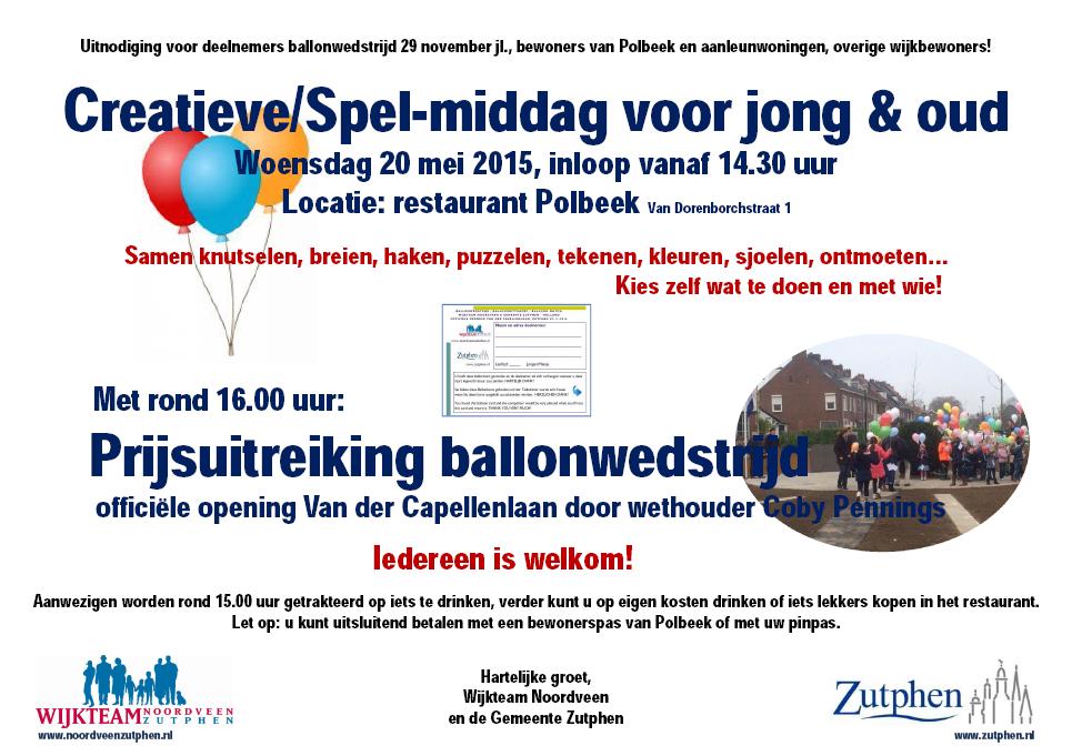 Voor deelnemers van de ballonwedstrijd op 29 november jl., bewoners van Polbeek en aanleunwoningen en alle overige wijkbewoners organiseerden Wijkteam Noordveen en de Gemeente Zutphen een creatieve/spel-middag op woensdag 20 mei 2015.