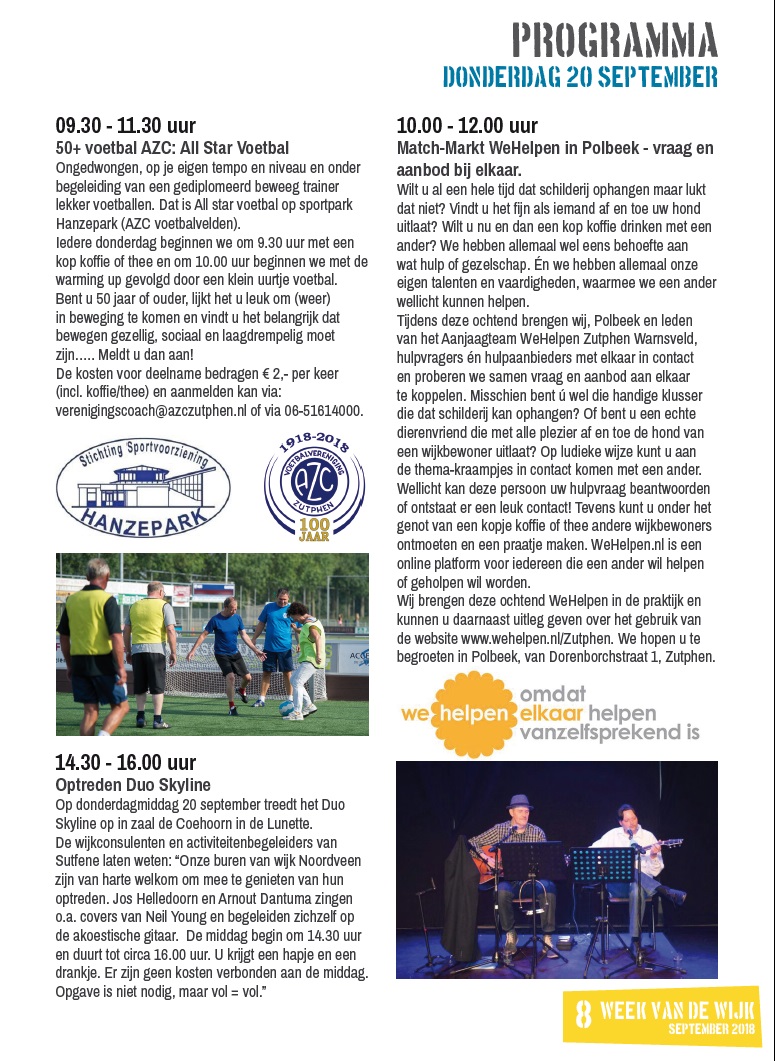 Programma donderdag 20 september – Week van de Wijk 2018Nieuws, Projecten, Week van de wijk, Week van de wijk 2018 Het programma van de donderdag in de Week van de Wijk is zeer gevarieerd: voetbal, Match-Markt en een muziekoptreden, op verschillende locaties in de wijk. Lees hieronder meer: