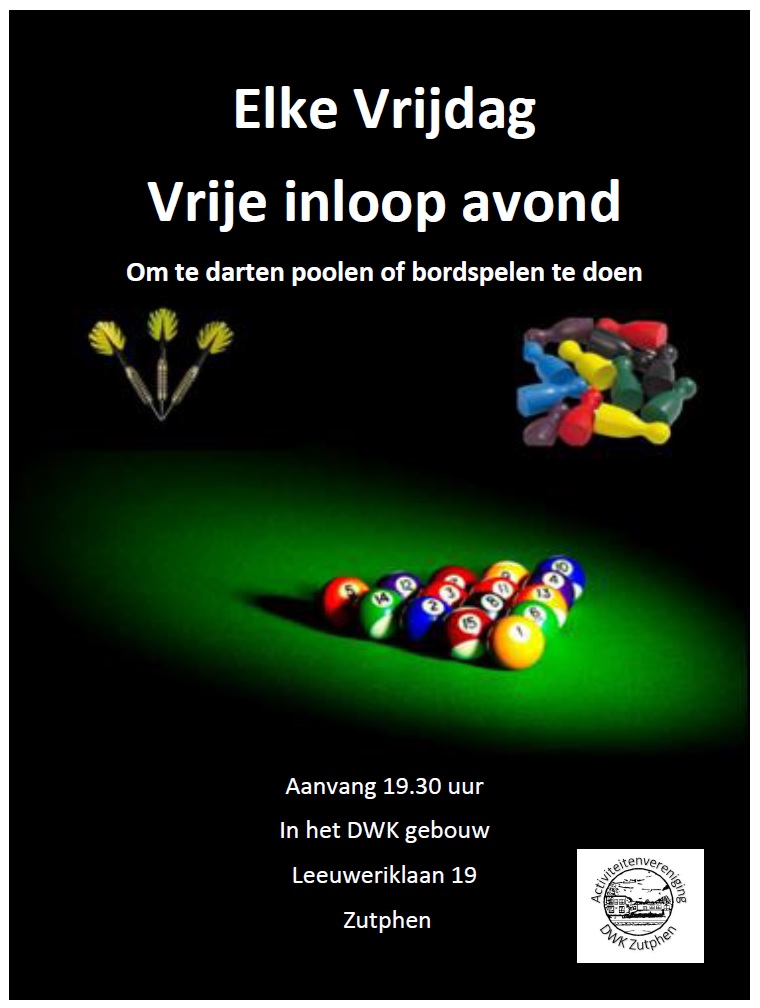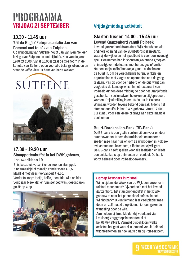Op deze vrijdag is er de hele dag wat te doen, een fotopresentatie in zaal de Coehoorn in de Lunette, levend ganzenbord door de wijk vanuit Polbeek en lekker stamppotten eten in het DWK-gebouw. Na afloop van het stamppottenbuffet kunt u in het DWK-gebouw desgewenst de avond nog vullen met darten, poolen, gezelschapsspellen en leuke ontmoetingen tijdens de Vrije Inloop van Activiteitenvereniging DWK. De bar is open!