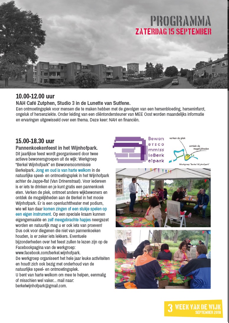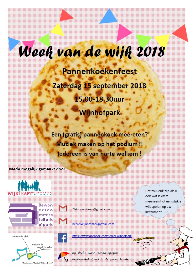 In de middag en vroege avond organiseert de Werkgroep “Berkel Wijnhofpark” een activiteit in de natuurlijke speel- en ontmoetingsplek in het Wijnhofpark, gelegen in de buurt Berkelpark van de wijk Noordveen in Zutphen i.s.m. Bewonerscommissie Berkelpark, het jaarlijkse pannenkoekenfeest!