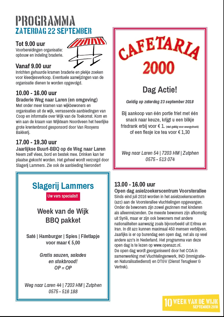Programma zaterdag 22 september – Week van de Wijk 2018Nieuws, Projecten, Week van de wijk, Week van de wijk 2018 Op burendag is er in Noordveen altijd veel te doen. Dit jaar zijn er die dag ook twee speciale dagacties, één bij Slagerij Lammers, één bij Cafetaria 2000. En kijk eens wat een mooi programma!