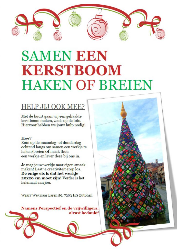 Met de buurt een gehaakte of gebreide kerstboom maken, dat is het idee van de beroepskrachten van Perspectief Zutphen (Sociaal Wijkteam Noordveen) en betrokken vrijwilligers. Een leuk idee waarvoor natuurlijk wel hulp nodig is. Op onderstaande flyer is te lezen op welke manier geholpen kan worden.