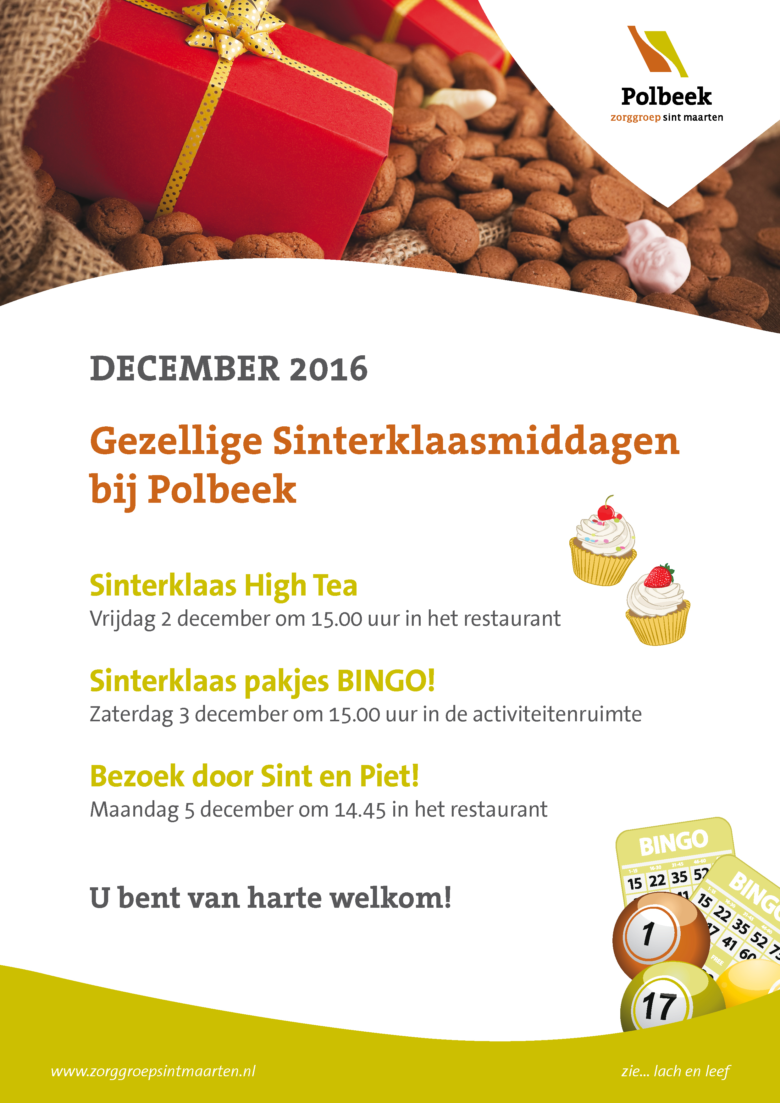 Polbeek nodigt alle wijkbewoners uit voor onderstaande activiteiten. Op maandagmiddag 5 december komen Sint en Piet in Polbeek! Op vrijdag 2 december kunt u terecht voor een High Tea en op zaterdag 3 december voor de Sint Pakjes bingo. Een aanmeldformulier voor de High Tea is te vinden onderaan de pagina.